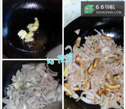 3 锅里油继续烧热,放入姜片,蒜等辅料炒出香味,放入切好的洋葱,翻炒23min后放入刚才捞出的肥肉干,一起翻炒。