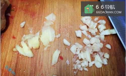 3开始准备凉拌时所需要的调味料,取少量生姜、蒜头,生姜去皮洗净切成细丝,蒜头拍碎去皮切成蒜末,还有准备一味很重要的调味品香油。