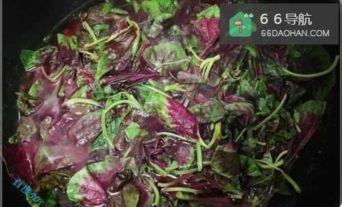 5往烧开的水中加入前面洗净的苋菜叶,用筷子翻动,让其均匀没入水中,大约2分钟左右,将苋菜捞出,放入前面准备好的开口碗中,用筷子均匀搅拌,让苋菜均匀沾染酱汁。