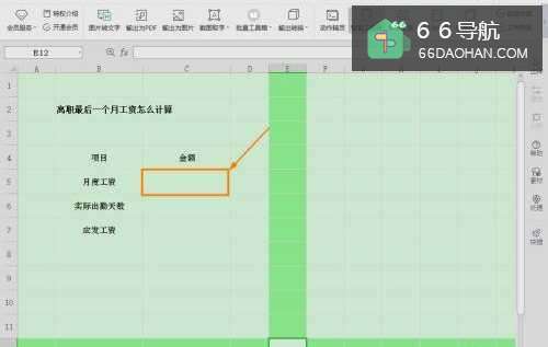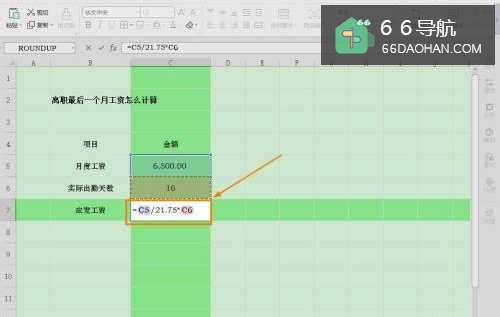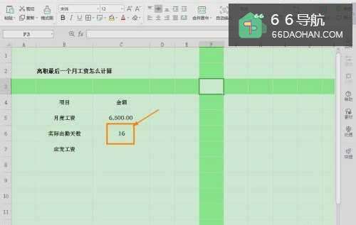 2选择单元格【C6】,输入离职当月的实际【出勤天数】。