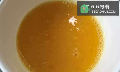4鸡蛋液搅拌均匀后,用勺子撇去表面的浮沫。