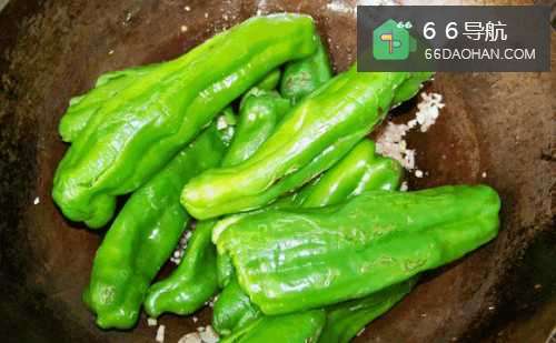 2空锅不放油,下青椒,中火微炕至青椒略显疲软。