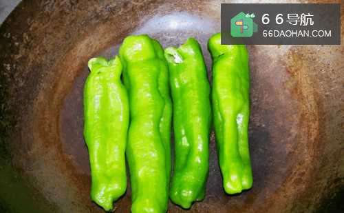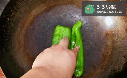 3用手按压青椒,使其紧贴锅壁,持续烧炕至呈现虎皮,拿出待用。