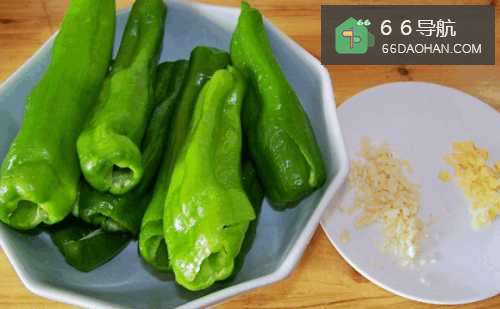 1.青椒洗净,去籽,保持整只形象,用刀背拍裂,姜蒜切米待