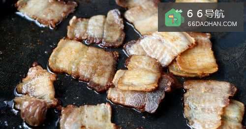 5锅内放适量的色拉油,放入五花肉翻炒,加入适量的盐、生抽翻炒均匀;
