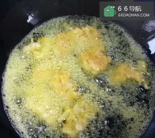当油温上升时,捞起适量的面糊,将其放入油盘中。