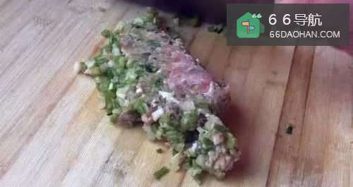 3买来的肉馅解冻,刚买回来的可以直接跟芹菜萝卜丁混合在一起,再次混剁。