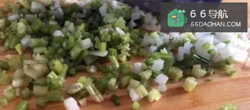 2将芹菜和白萝卜全部切成丁,然后混合在一起继续剁碎。
