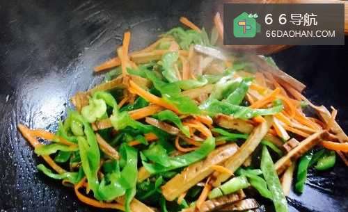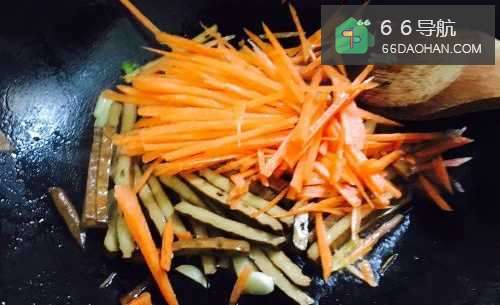 5之后依次放入胡萝卜丝和青椒丝,开大火翻炒1分钟左右即可。