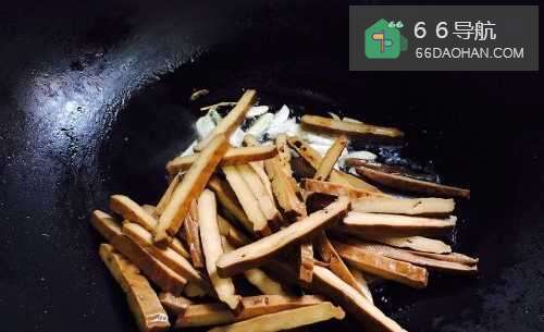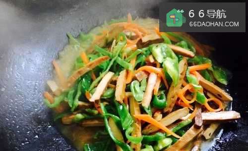 6在翻炒过程中可以加入少量水,让青椒胡萝卜香干不会太干。
