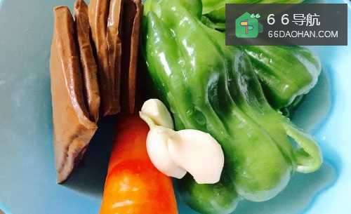 首先将青椒去蒂去籽,胡萝卜去皮,蒜瓣去皮,香干洗净沥干水分备用。