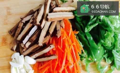 2接着将青椒、胡萝卜、香干全部切成丝,蒜瓣切成片备用。