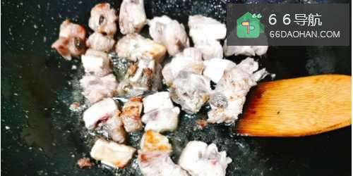4锅烧七成热放少量花生油,放入排骨翻炒一分钟。