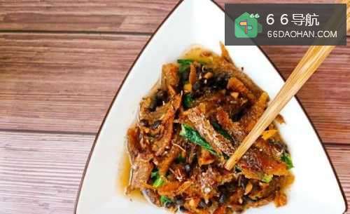 3从豆豉鲮鱼罐头里取2条鱼肉和一勺豆豉,然后用手把鱼肉掰开,将比较粗的那根骨头剔除,其余的鱼肉掰成小块。