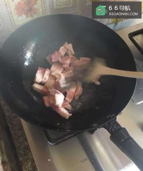 油锅烧热后,先放入五花肉煸炒,因为是肥瘦相间的,所以需要多煸炒一会儿,放肥肉部分煸炒至金黄,放入酱油。