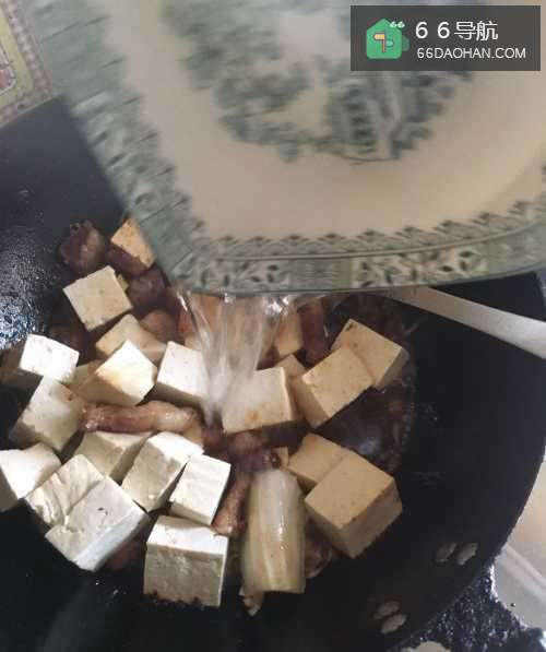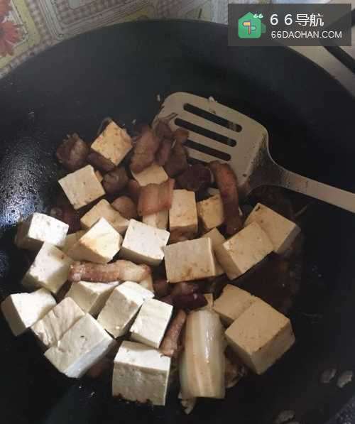 3放入准备好的豆腐,继续翻炒,如果觉得颜色有些浅可以再加入少许酱油,耗油,继续翻炒。