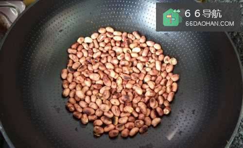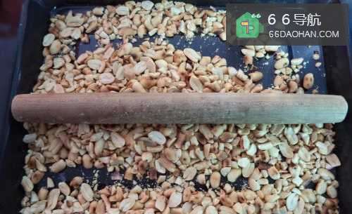 3 将炒熟的花生去皮,用擀面丈擀碎。
