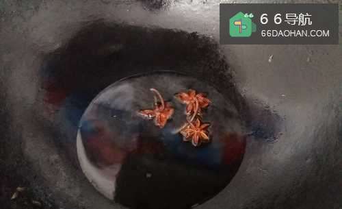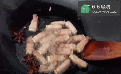 4锅内倒油,凉锅放入几个大料瓣,加热,炒香,然后放入切好的肉墩。