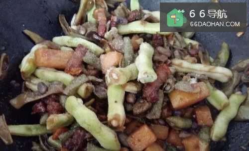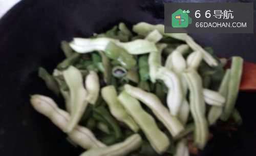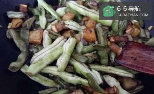 6放入豆角段,翻炒,尽量吸收上肉煸出的油。