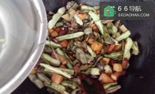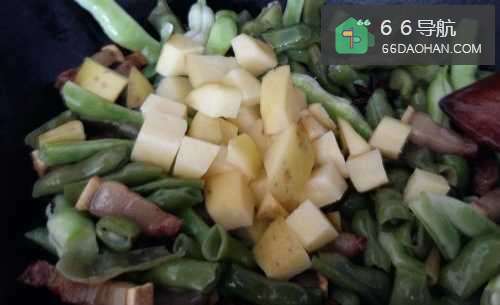 7待豆角由浅白绿色变成翠绿色时放入土豆块一起炒匀。