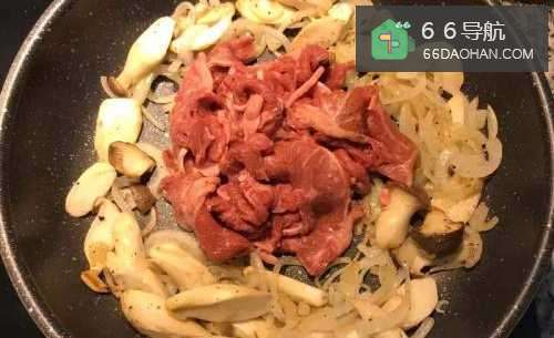 5将洋葱和杏鲍菇拨放到锅的另一边,接下来放入腌好的牛肉片煎炒
