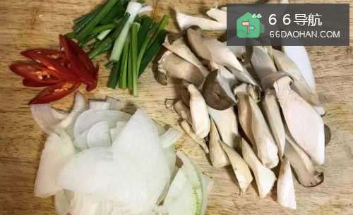 2洋葱去皮后对切,再切细丝;杏鲍菇滚刀切;葱切段;辣椒斜切