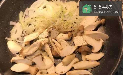 4放入杏鲍菇,并加入黑胡椒粉一起拌炒到略微上色后