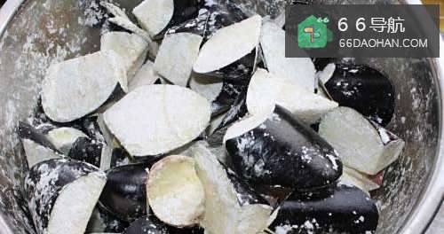 3将茄子上均匀裹上淀粉,鸡丁放淀粉腌制10分钟。