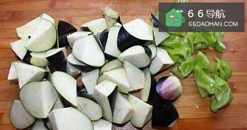 2然后将茄子和辣椒切块,鸡腿剔除骨头,切成丁备用。