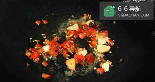 5锅中放少许油烧热,放入八角、花椒、蒜片、泡椒炒香。