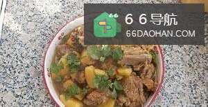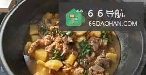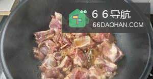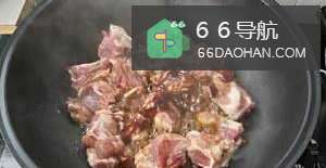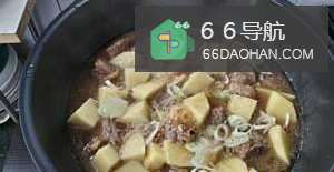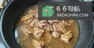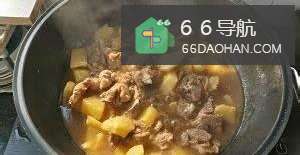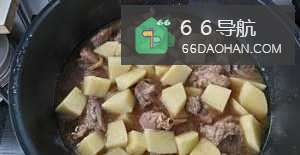 6当排骨炖好时,把土豆块沥水倒入锅内,再加入一点清水没过排骨跟土豆块。