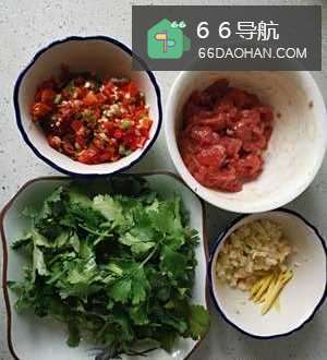 辣椒,蒜切碎,姜切丝,香菜切断。