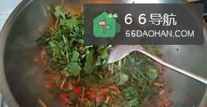 6加香菜,大火迅速翻炒,香菜很容易熟,一定要最后放,也不用炒太久。