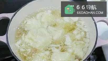 5锅内入油,油量根据锅子大小以能完全没过牛奶块为准,小火烧热,耕醒将沾裹好的牛奶会放入,注意轻轻搅动,以防粘连~