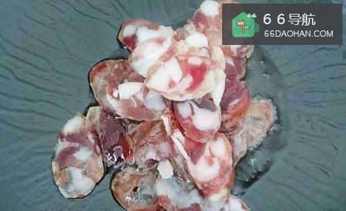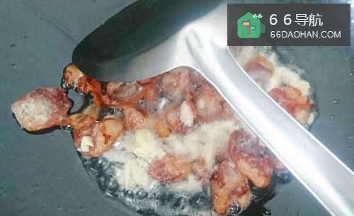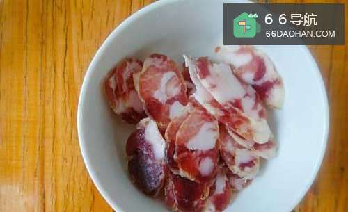 4热锅倒油,油量可以比平常炒菜时的少些,放入腊肠,小火慢慢煸出油脂,使腊肠里的肥肉变成半透明状态。