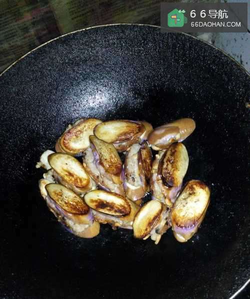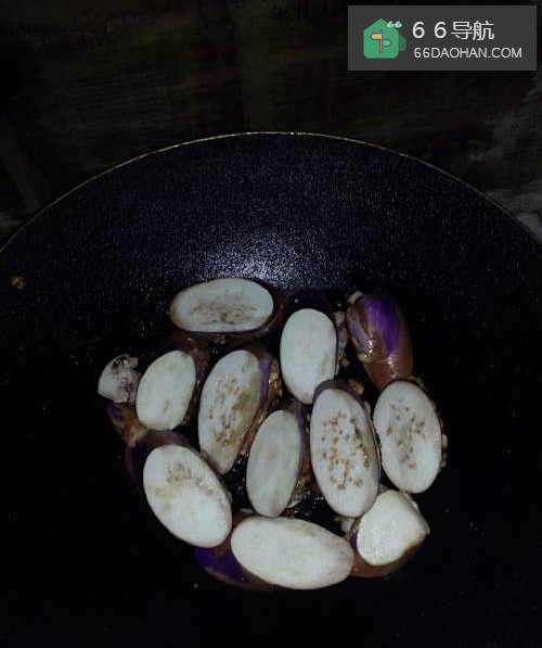 11放好茄子进锅里,然后打开火开始煎,刚开始的时候大火把油烧开后小火慢慢煎,有些地方可能煎不到,要适当移一下锅,让整个锅受热均匀,大概煎八分钟后关火。