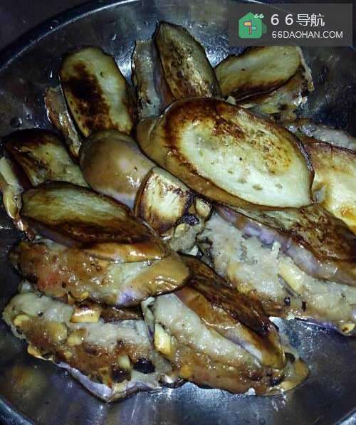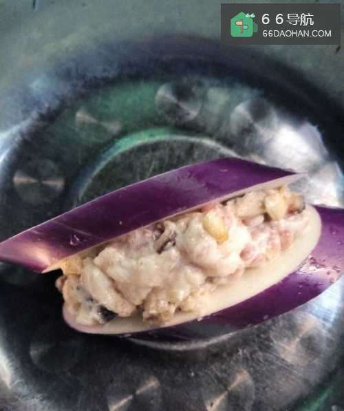 然后就可以做茄子酿了,把馅放到茄子切缝里,先不用很厚,也就你切茄子2厘米的一般就行了)。