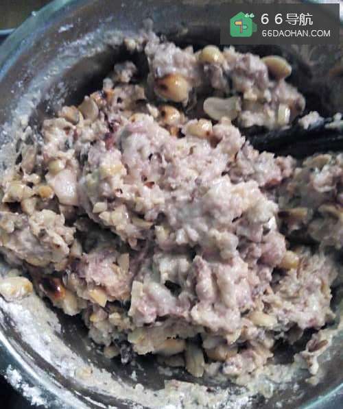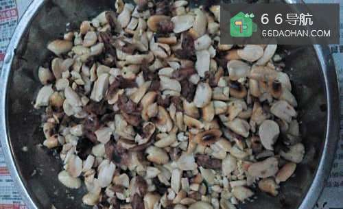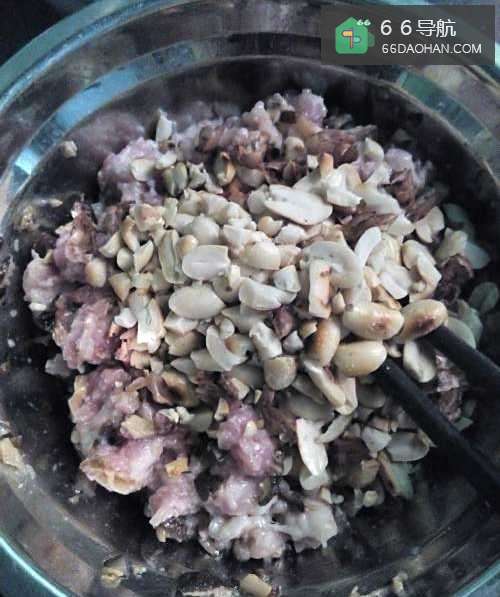 5再把炒好压碎的花生倒进装肉的盆子里,如图所示。