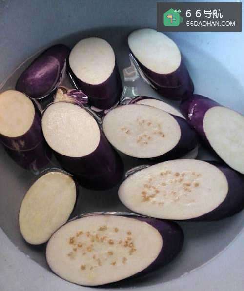 2茄子洗干净切好,(茄子要切2厘米一块,然后在一块中间切开,不要切到底),然后用水浸泡半个小时左右。