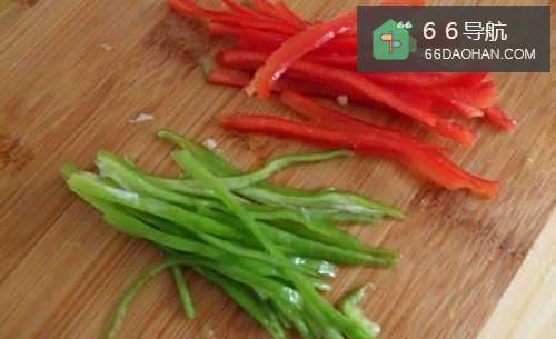 33、取青红辣椒洗净,切成细长条,蒜头拍碎切成末,香菜切碎备用。