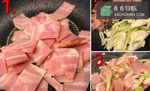 33、锅热油加入培根炒至微焦,将蒜末、大葱爆香,然后一起翻炒