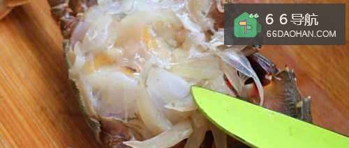 4把蟹背面的软壳切掉,再把蟹切分为二,这时可以把捆绑蟹的绳子剪掉并用刀在蟹腿上拍几下;