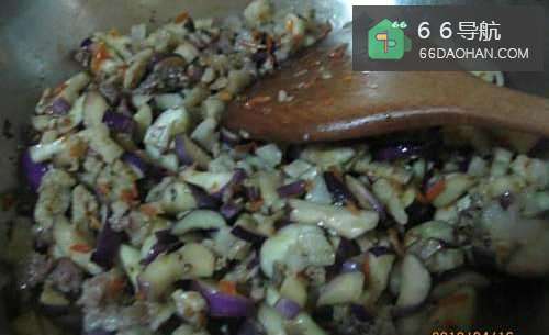 茄子对半切开,然后切小后片,用淡盐水泡,然后起油锅炒藕丁和肉馅
