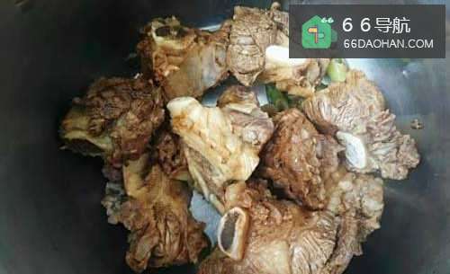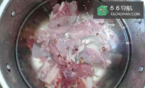 3将牛排骨放在锅内,倒入没过食材的凉水,撒10粒花椒进去,煮开后瓢去锅中的浮沫,将牛排捞出,放在流水下冲洗干净。