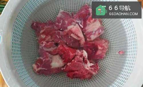 1将牛排斩块,在水里浸泡两个小时。