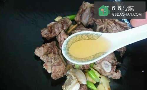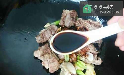 4热锅倒油,放入葱姜蒜煸香后,下入焯好的牛排略微翻炒,调入料酒和老抽。