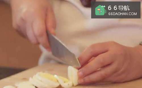 鸡蛋用水煮熟,一个切碎,另一个切成片。