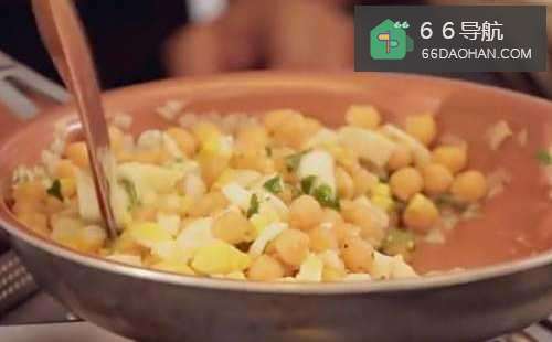 3再把沥干水分的鹰嘴豆,和鸡蛋碎下锅,撒上香菜