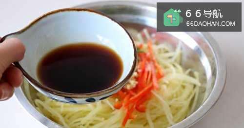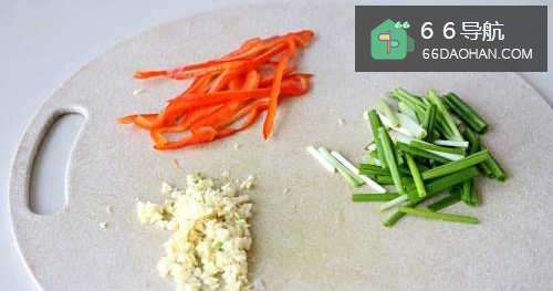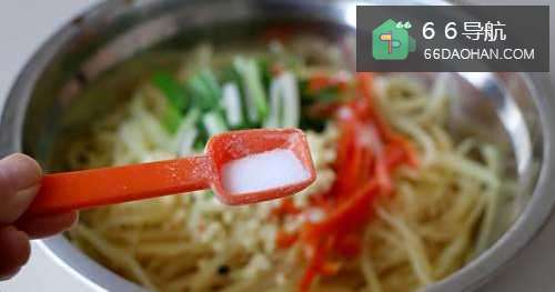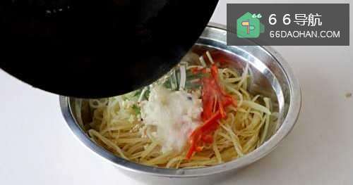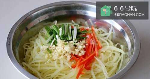 5大蒜、红椒、葱段放土豆丝上;