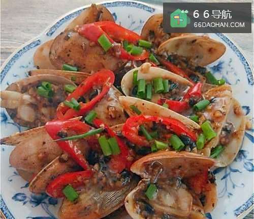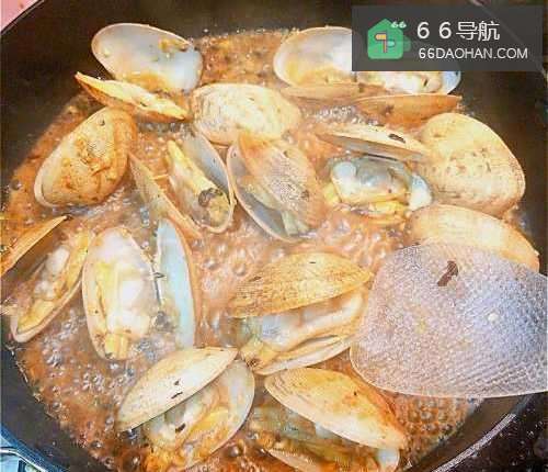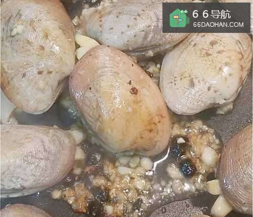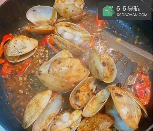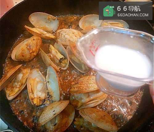 2然后下大蚬炒至打开囗,中途呛入料酒继续炒。